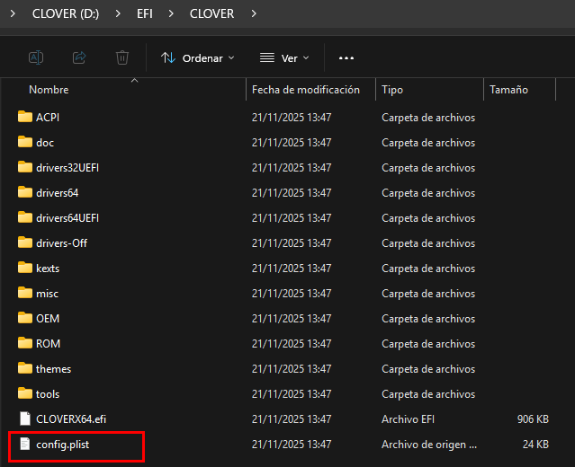 After download and unzip the Clover file. You found a folder with CLOVER name, open and inside you can found this content: