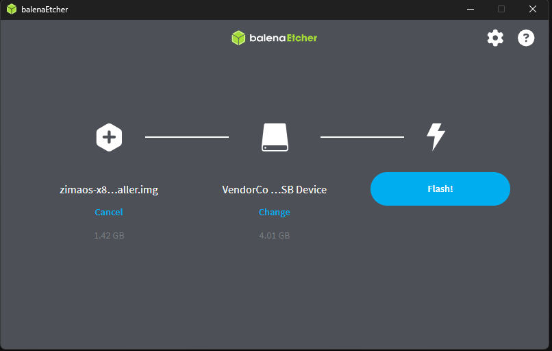 After downloads complete execute Balena Etcher, select the ZimaOS image, the second USB stick and clic to button Flash: